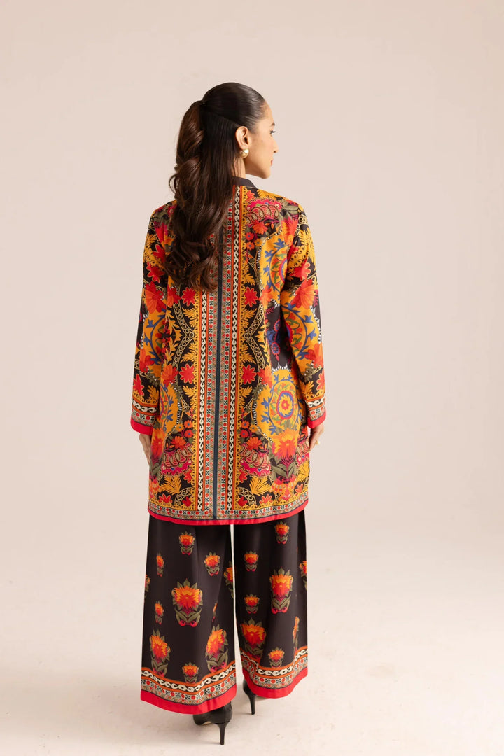 Unveil your bold and regal side with Midnight Majesty, a luxurious silk 2-piece printed suit that blends tradition with contemporary charm. The shirt features an exquisite fusion of warm gold, crimson, and sapphire tones — creating a mesmerizing tapestry of floral and geometric patterns. Paired with black silk trousers adorned with radiant floral motifs, this outfit exudes sophistication and confidence — perfect for festive evenings and elegant gatherings 🌙.