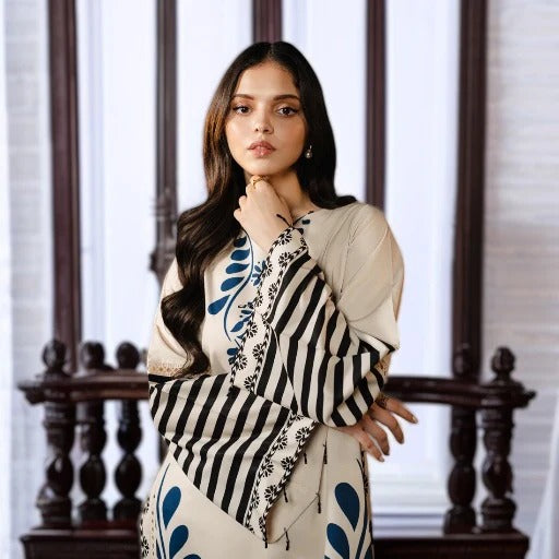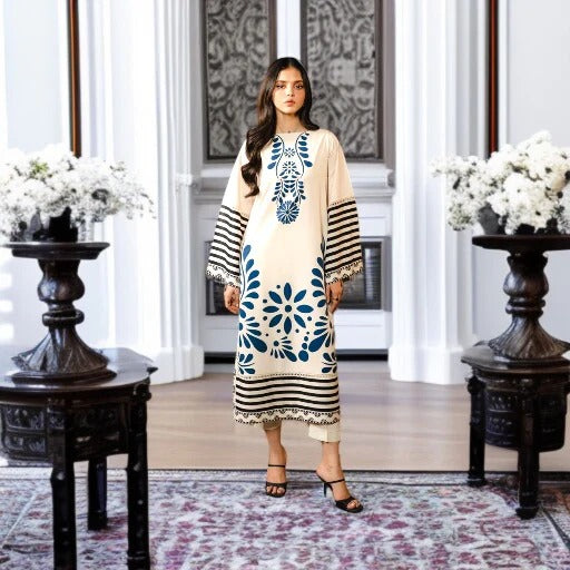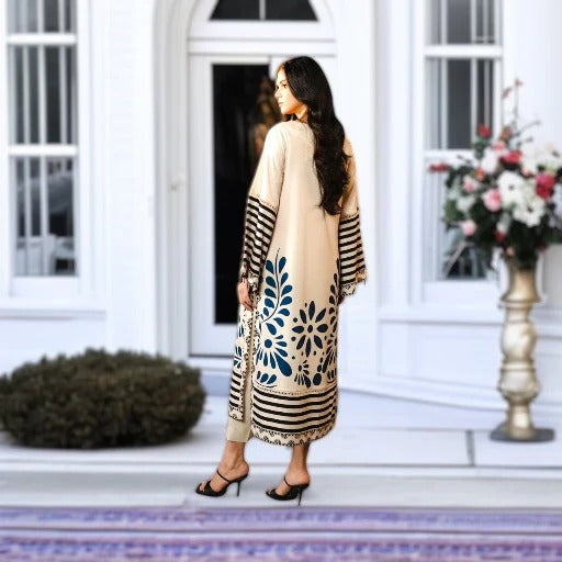 Step out in striking style with the Azure Harmony Printed Suit, a beautiful ensemble that effortlessly blends traditional comfort with contemporary design. This three-piece suit features a pristine off-white or cream canvas brought to life by bold, deep indigo blue prints.