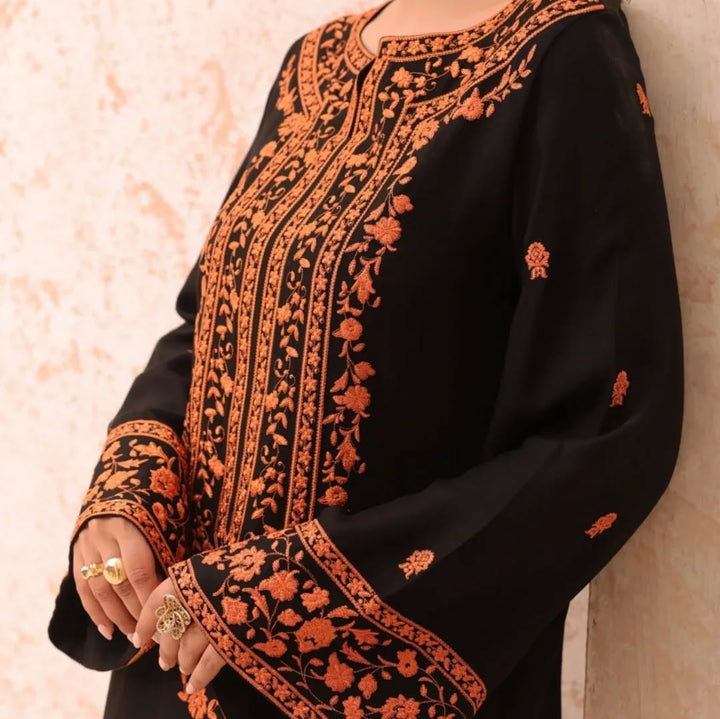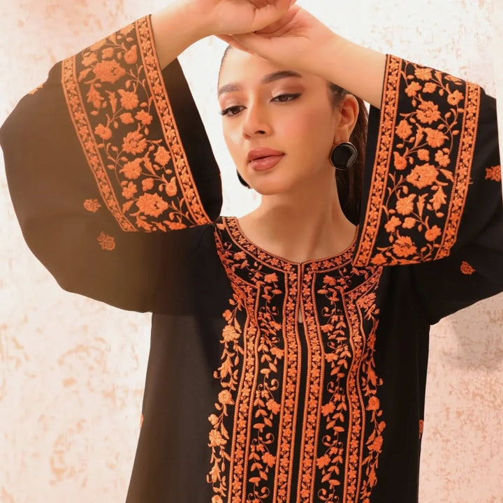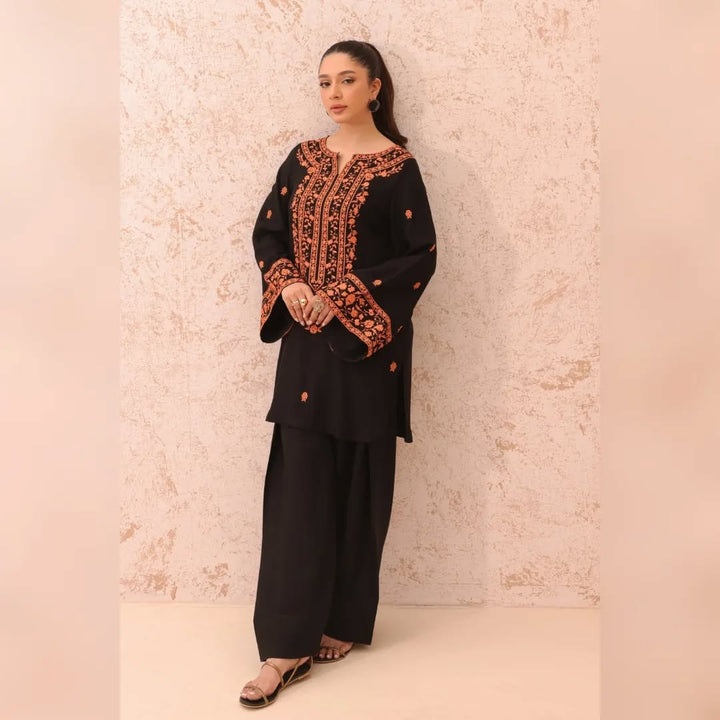 Step out in style with this elegant Dhanak embroidered 2-piece outfit, featuring exquisite orange embroidery on a deep black base. The intricate detailing on the neckline, sleeves, and front adds a touch of traditional charm, while the soft Dhanak fabric ensures comfort and warmth — perfect for the season.